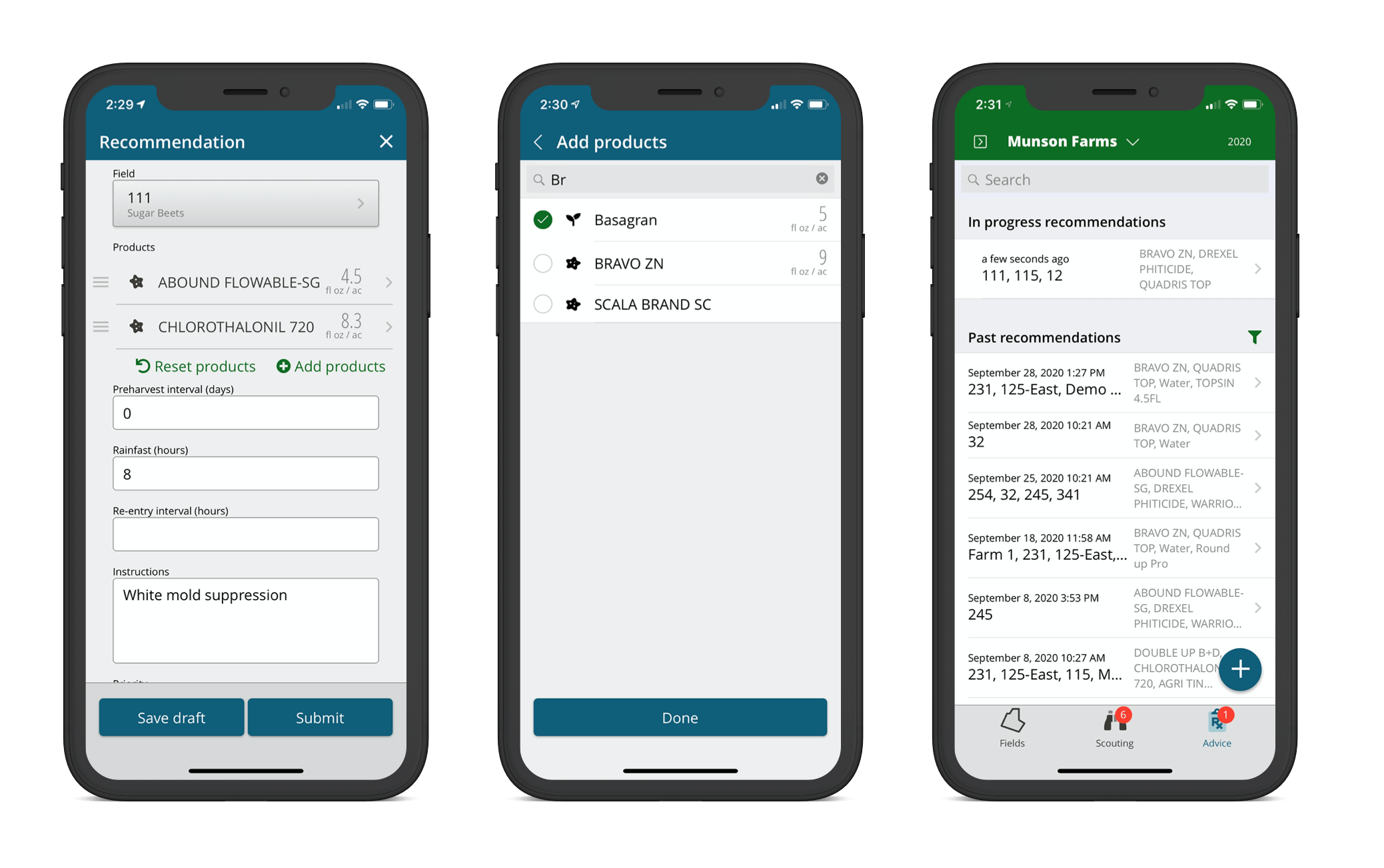 FarmQA Advice lets you create chemical recommendations with the same flexibility as our popular scouting app. Do you want to create a recommendation for multiple fields at once? Do you need to adjust the application rate for one of your products? Do you have specific instructions you want to be included in the report? FarmQA Advice puts you in control.