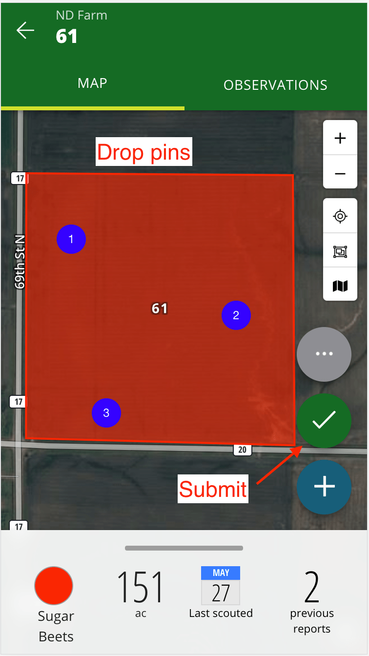 - In the FarmQA mobile app, find the field you’re, navigate to the location, and drop a pin.